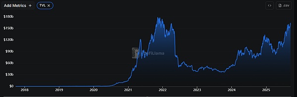 DeFiLlama 统计数据显示,截至发文时,全网 DeFi 总锁仓价值(TVL)超 1600 亿美元,接近 2022 年 11 月 1780 亿美元左右的历史巅峰水平。