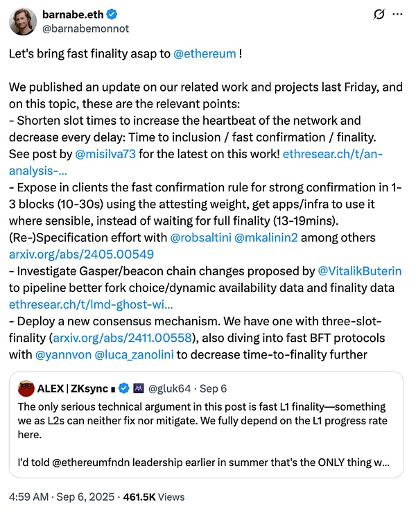 区块链中的“最终性”指的是:一旦交易被确认,就无法逆转或更改,也不会因为网络波动或链上重组而被撤销。所谓“快速最终性”,就是在几秒甚至亚秒级别就能提供这种保证,而不是让用户等待十几分钟。并且,由于 L2 的最终确认依赖于 L1,所以无论 L2 的处理速度多快、功能多强,其安全性与最终确认速度依然要以 L1 为基础。