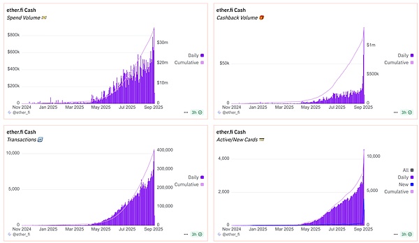 IOSG 其实早就在 ToC 应用端有所布局,并且投资了 Ether.fi。一个能生息的支付超级应用,其卡交易量,cash back 体量,交易笔数和发卡量,均在 9 月达到其历史最高值。