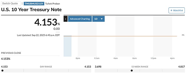 若此态势持续,可能压制加密市场贝塔表现。据MarketWatch十年期国债页面显示,十年期收益率维持在4.1%附近,美元指数与谨慎的股指期货同步走强。
