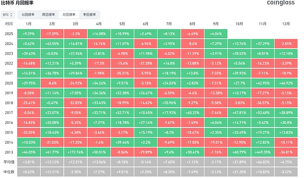 季节性因素影响基准概率。Coinglass月度回报表显示10月历史上多数实现正回报中值,交易员戏称为"上涨十月"。