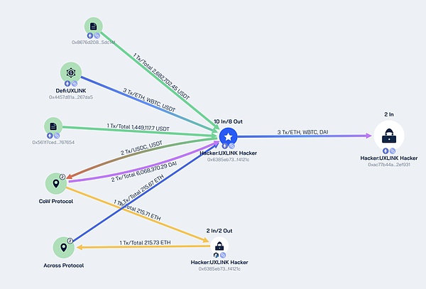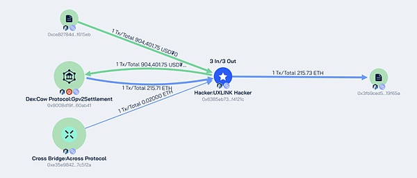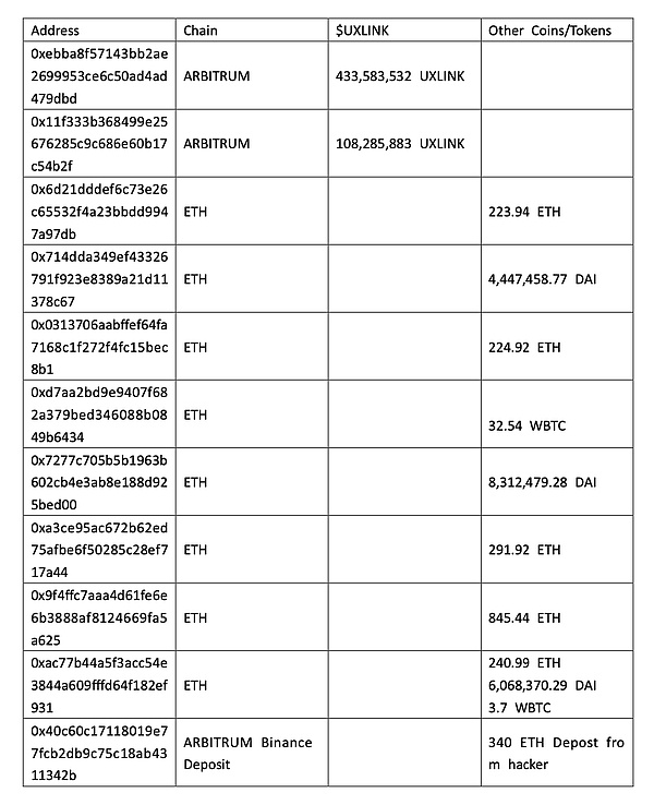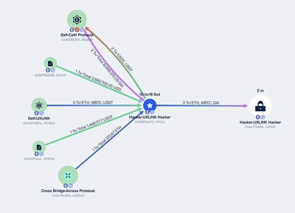 攻击者增发了5次代币,三个收取代币地址0xeff9cefdedb2a34b9e9e371bda0bf8db8b7eb9a7、0x2ef43c1d0c88c071d242b6c2d0430e1751607b87、0x78786a967ee948aea1ccd3150f973cf07d9864f3通过兑币、中转和跨链将UXLINK代币兑换为ETH和DAI储存在ETH链地址上。