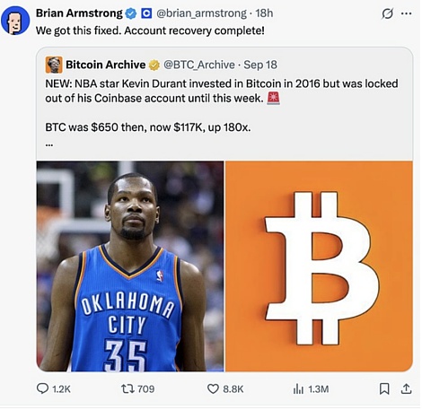 2025年9月18日,Coinbase官方宣布,NBA球星凯文·杜兰特(Kevin Durant)找回了Coinbase的账号和密码。随后,杜兰特在短时间内出售了3000余枚比特币,套现约3.5亿美元。据杜兰特称,他于2014或2015年初次接触比特币。当时他为了看YouTube影片,在Coinbase上购买了少量比特币。此后,杜兰特加盟金州勇士队,并在一次宴会上再次对比特币产生浓厚的兴趣,随后购买了大量比特币。不过,杜兰特后来忘记了Coinbase账户的密码,直到近期才成功找回。