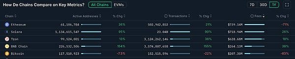 过去一年,如果只看公链的总交易费用收入,可以更清楚看到哪些链真正转化出了使用价值。以太坊全年收入为 7.39 亿美元,仍然是最主要的收入来源,但受到 Dencun 升级和 L2 分流影响,同比下降 71%。相比之下,Solana 年收入达 7.19 亿美元,同比上涨 26%,在 Meme、AI Agent热潮的带动下实现用户活跃度和交互频次的显著提升。Tron 收入为 6.28 亿美元,同比增长 18%。而比特币全年收入为 2.07 亿美元,主要受铭文交易热度下滑影响,整体跌幅明显。