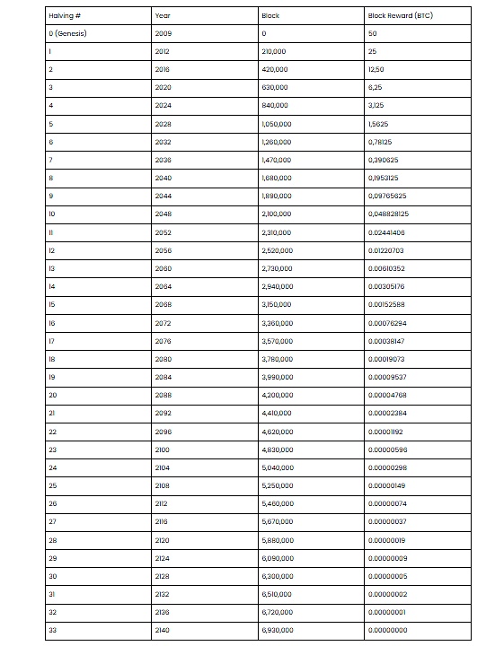 由于每次减半降低奖励但挖矿仍维持约每 10 分钟一个区块的速度,比特币供给将以涓流速度缓慢释放,直至触及 2100 万枚上限,因此时间线将延续至 2140 年。