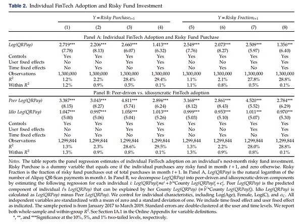 接着,该研究介绍了金融科技采用程度的测量方法,并以2017-2019年中国二维码支付的快速扩张为背景,构建了个体层面的FinTech使用指标QRPay。借助蚂蚁集团的账户级数据,研究能够精确追踪用户从数字支付向投资行为的迁移路径。进一步的实证分析显示,更高频的数字支付显著提升了用户投资风险基金的可能性,而通过同伴效应与地理距离等工具变量的识别,论文为这一关系提供了坚实的因果证据。