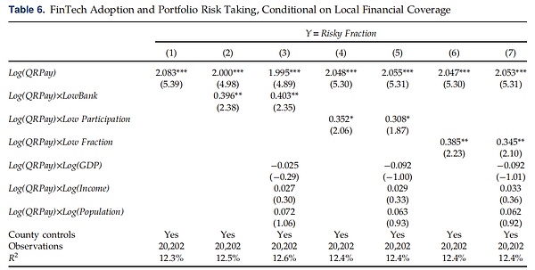2. 表6:金融科技应用与投资组合风险承担:基于当地金融覆盖情况的分析