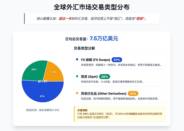 全球外汇日均交易量7.5万亿美元,但只有28%是现货"换汇",51%是FX掉期——本质上是美元借贷
