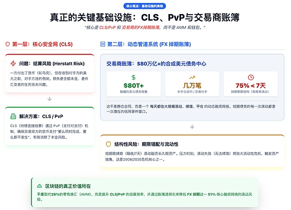 "关键基础设施是CLS/PvP和交易商的FX掉期账簿,其中隐藏着80万亿美元以上的美元债务,而不是AMM和钱包。"