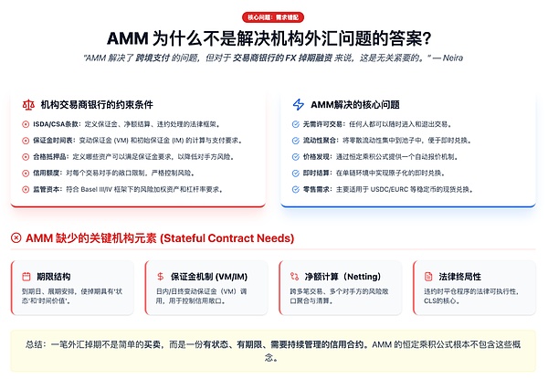 AMM解决的是无需许可交易和流动性聚合,机构要的是信用管理、监管合规和结算安全——两套需求几乎没有交集