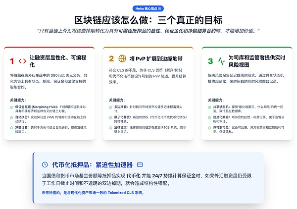 它们不需要"无需许可"——恰恰相反,它们需要严格的准入控制和信用评估。它们不追求"24/7交易"——它们追求的是与现有监管框架兼容的运营效率提升。它们不在乎"去中心化"——它们在乎的是敞口透明、结算安全、符合资本要求。