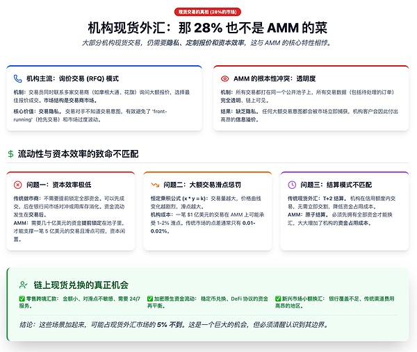 机构现货外汇主要通过RFQ(询价交易)完成,隐私是核心需求,而AMM的链上透明性恰恰是机构最不想要的