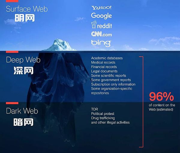简单总结一下,整个互联网可以分为明网和深网,区别在于内容能否被普通的搜索引擎检索到,其中占了 96% 份额的深网中还有一小部分被称为暗网,需要特定的浏览器、特殊授权或是特殊设置才能访问,隐秘性强且大部分都是非法的内容。