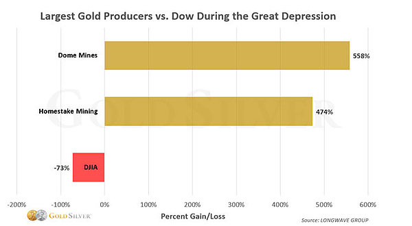 看看这两只最大的黄金股与道琼斯指数(Dow)在美国有史以来最严重通缩期间的总表现吧。