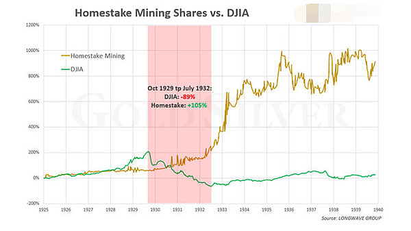 当时美国公民不能拥有黄金,但他们可以拥有黄金股票。矿业公司有一个有保证的销售价格(因为价格是由政府决定的),这使他们受益,因为他们的运营成本正在下降。那么,黄金股票在大萧条期间的表现如何呢?