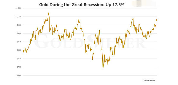 大衰退从2007年第四季度持续到2009年第二季度。这是美国历史上第二严重的通货紧缩——所以尽管金价有时会波动,但在这一令人衰弱和恐慌的通缩时期,金价却出现了上涨。 这里我们要吸取一个教训:通货紧缩的影响实际上是促使投资者投资黄金。 与其说黄金对通缩的反应较小,不如说是黄金对当时极端性质的事件反应更大。正是这场危机促使投资者买入黄金,尽管当时官方已进入通缩时期。 在极端危机时期,即使是本质上是通缩的危机,人们也会寻求黄金作为避风港。这在历史上一再得到证实。