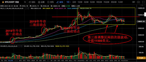 日线级别指标来看,这两个月比特币都是在震荡整理行情,有时候也插针,目的是上下爆仓高倍杠杆和合约,从下图看到比特币现阶段处在2019年牛市第三浪启动点的刺激波动走势,中值11500美元。