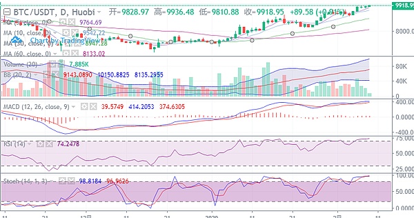 日线图中,K线已经接连四日收阳,各均线均多头排列整齐,而币价稳稳坐落于各均线上方波动,由此来看多单操作占据很大的优势;从近两日的K线形态来看,都以十字型收线,且下影线较长,说明在开盘之后行情偏为下行,而在后期多方的竭力阻挠之下,成功的将局势扳回,最终多方相对更为强势一些;且两日均在下行至低位9670附近时就出现反转向上的力量,看来在其下方存在强劲的支撑力量,才导致后面的触底反弹;综合来看不管是当前的减半催使还是各项指标均有助涨之意,中长期的走势应以上行为主。