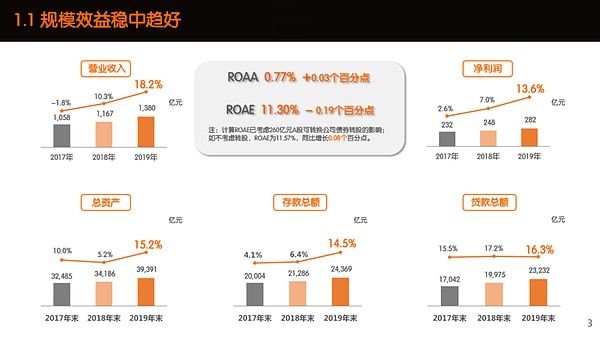 从规模效益来看,平安银行过往三年的营业收入、净利润、总资产、存款总额以及贷款总额连年攀升,特别是在2019年,各项指标较上年的增幅均超过10%。