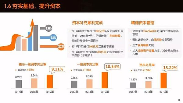 平安银行与2019年多次发行债权进行资本扩充,目前已完成核心一级资本充足率、一级资本充足率和资本充足率的显著提升。