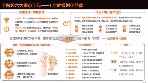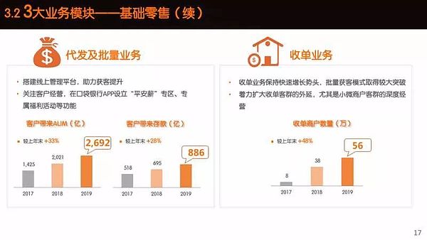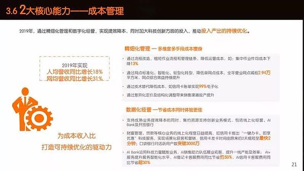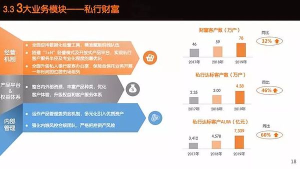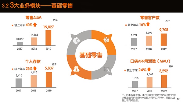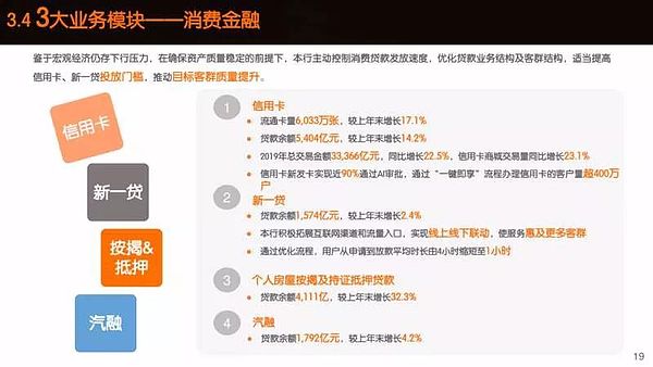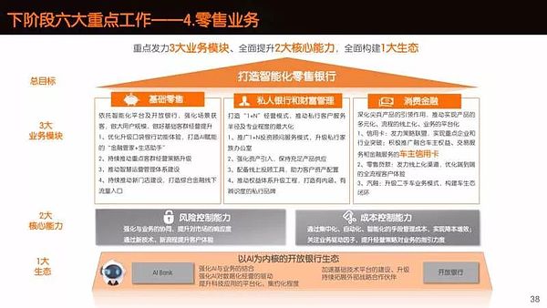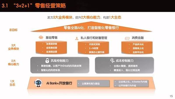 具体来说,“3+2+1”经营策略即发力3大业务模块(基础零售、私人银行和财富管理、消费金融)、2大核心能力(风险控制能力、成本控制能力)、1大生态(AI Bank开放银行)。