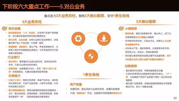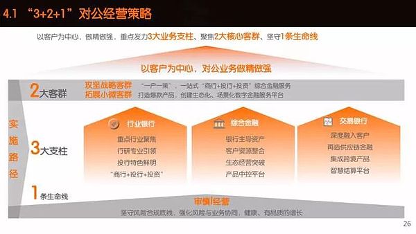 此处的“3+2+1”对公经营策略具体指重点发力3大业务支柱(行业银行、综合金融、交易银行)、2大客群(攻坚战略客群、拓展小微客群)、1条生命线(审慎经营)。