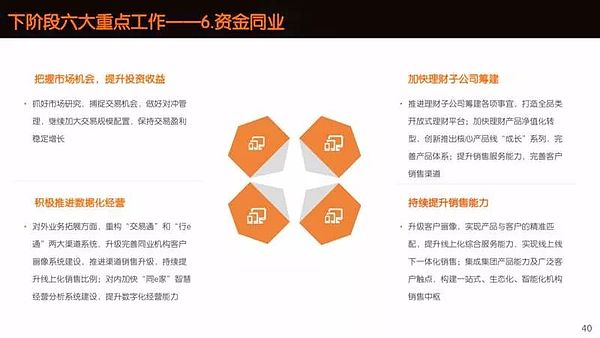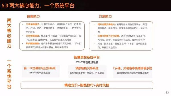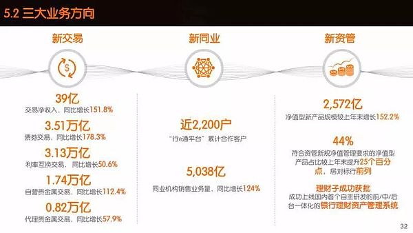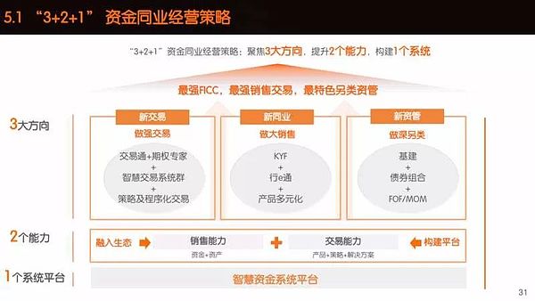此处的“3+2+1”资金同业经营策略指3大方向(新交易、新同业、新资管)、2个能力(销售能力、交易能力)、1个系统平台(智慧资金系统平台)。