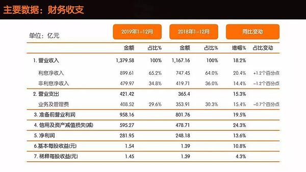 据财经涂鸦消息,平安银行(000001)2019年度业绩发布会于昨日(2月14日)在平安银行总行南塔举行,当天发布《2019年度经营情况报告》,主要盘点了过去的经营业绩与方法,并展望了未来的工作重点。