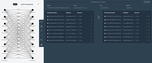 对于Dash的PrivateSend交易,用户的资金会被分成以下几类标准面额:10、1、0.1、0.01或0.001 DASH。然后这些资金将以混合交易的形式发送,且该交易仅包含特定某一种面额(例如像上面的屏幕截图一样,所有输入和输出都是0.1 DASH)。用户最后拿回的Dash数额不变,但这笔资金已与其他PrivateSend用户的资金混合了。这些混合交易可以在之后通过PrivateSend再发送给另一个用户。