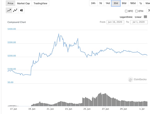 这是因为前几日看到一样新玩意儿——所谓治理通证的COMP。对区块链的基客(geek)来说,6月15日COMP上链交易可谓一件盛事,短短几天,这款虚拟币的交易价格就翻了几番。