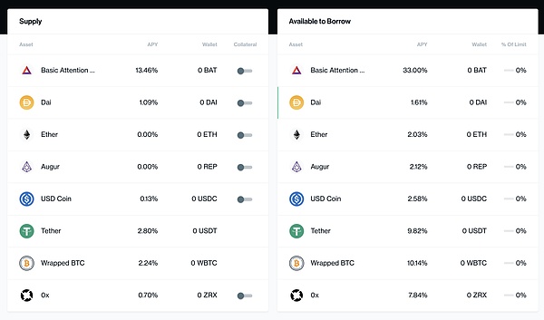 除此之外,用户在Compound平台的存款和借款利率之间存在重大差异,前者显著比后者低。下面这张图是北京时间6月29日下午4:40左右Compound平台显示的利率,左侧为存款利率,右侧是借款利率,其中利差最大的幅度接近20%。