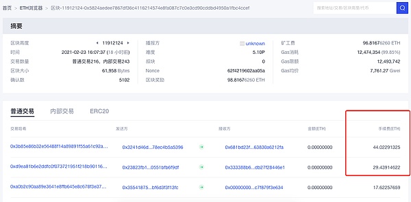 与此同时,受恐慌性抛售的影响,以太坊区块链网络发生拥堵,并出现少见的高额手续费。据欧科云链OKLink数据显示,2月23日16时07分37秒,以太坊在区块高度11912124的交易费用达到96.81ETH,该区块中出现了两笔手续费异常高的交易,费用分别高达44ETH和29.43ETH。