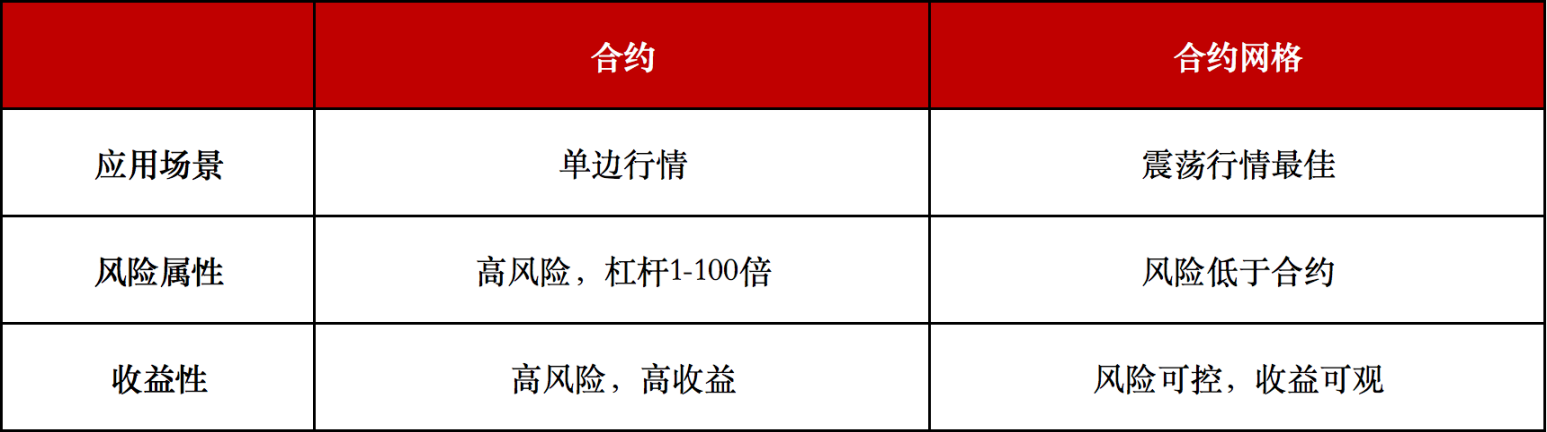 首先,我们要认清楚一点工具没有对错,也没办法简单的对比,就看用户的风险承受能力是否与工具的风险属性相匹配。 抛开高风险,高收益外,合约网格还有哪些特点: