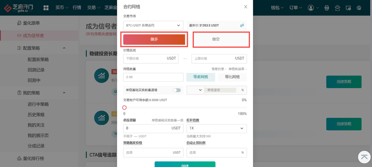 根据对行情的综合判断,选择开仓方向多或者空,这个步骤非常重要,决定了合约网格能否赚钱的决定性因素,后面专门介绍一下我的实战方法--趋势网格交易。