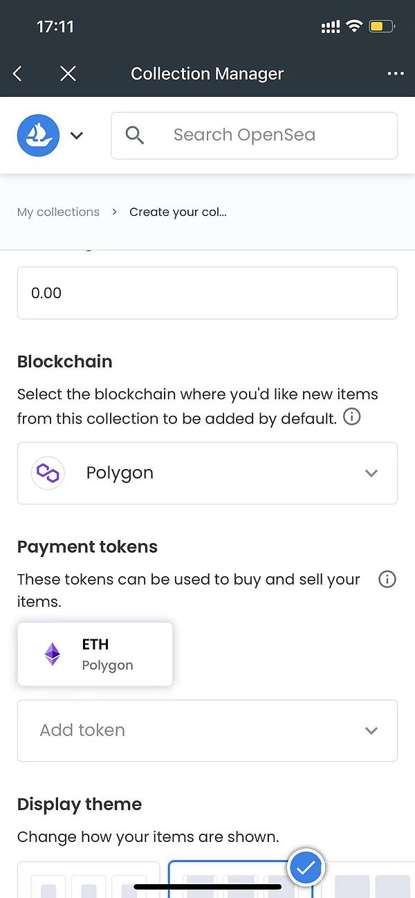 Blockchain 的选项中选 Polygon另外可以按自己需要选择 ETH、USDC 等token,作为该collection的交易token