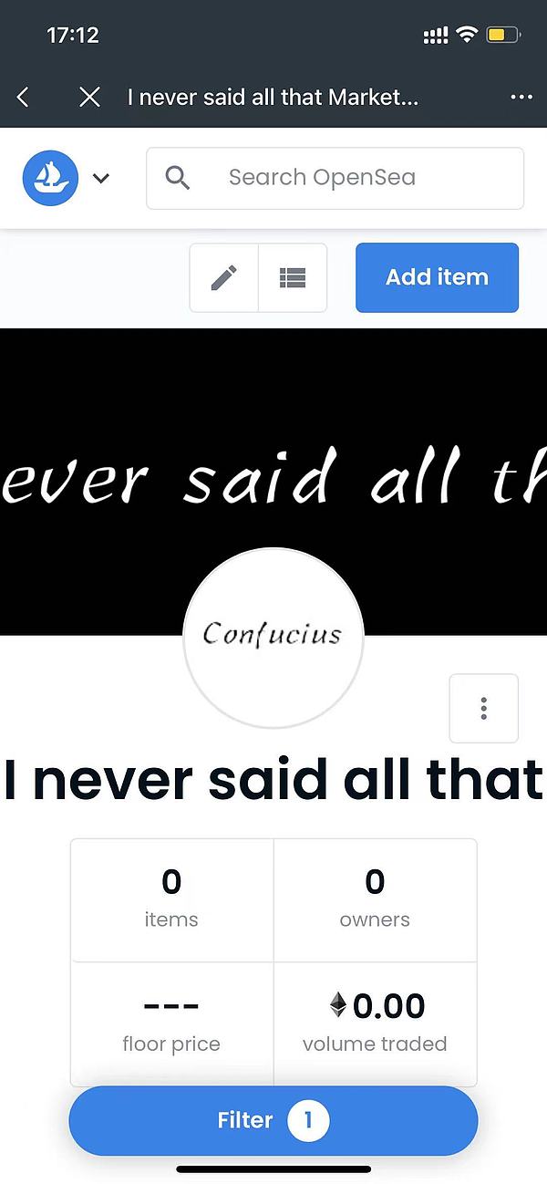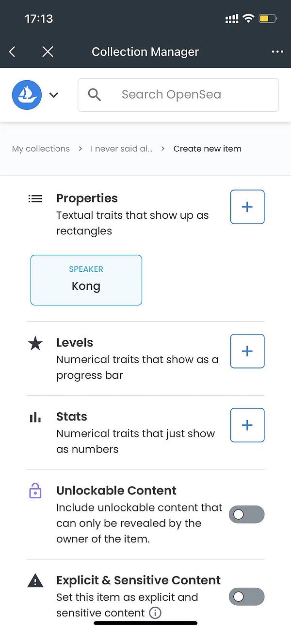 点击 Create 后,你就获得了一个空的collection然后点击右上角 Add item 开始创建具体的 NFT