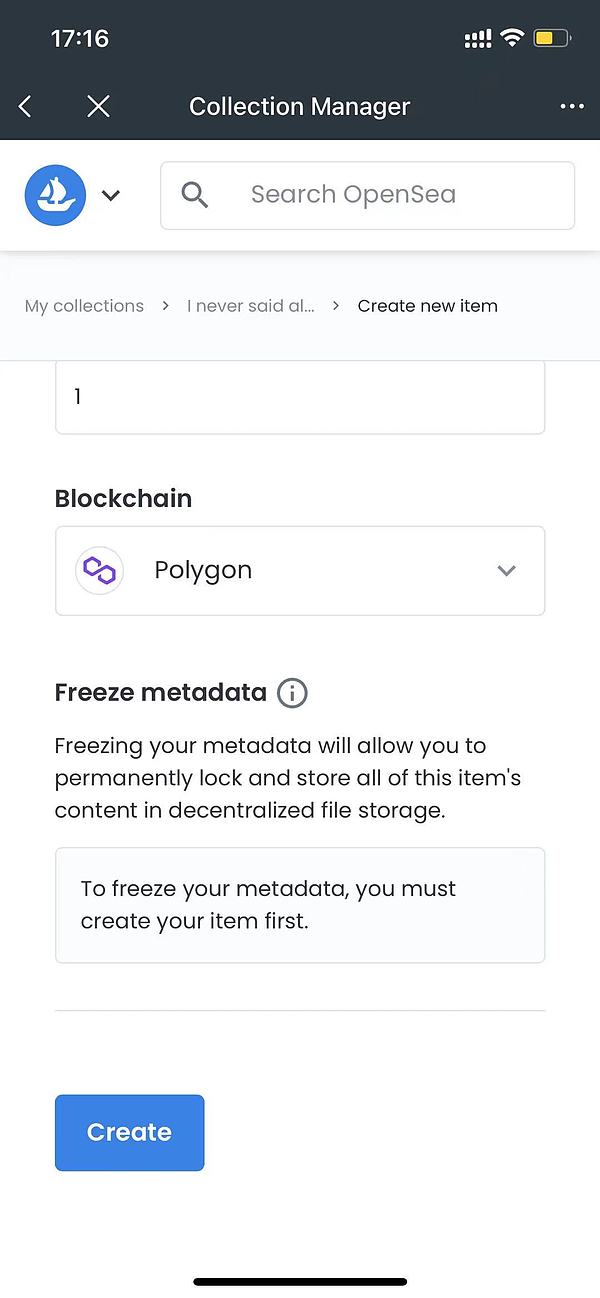 使用 OpenSea 创建 NFT 不需要消耗任何链上手续费,不过考虑到买家购买时的手续费,以太坊可能不适合单价不高的NFT,因此本文使用手续费较低的 Polygon 作为例子