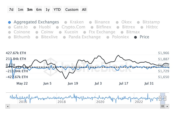 尽管过去几个月价格波动较小,但 ETH 的交易活动显示抛售较少。这意味着该代币的投资者基本上拒绝出售其持有的资产,而是继续持有。根据IntoTheBlock的数据,过去 90 天内 ETH 的净流量主要为负值。