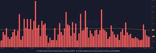 尽管过去三个月 ETH 交易利润丰厚,但抛售仍在减少。据Santiment称,根据 200 天移动平均线评估的 ETH 每日交易量盈亏比显示,该期间每发生一笔挽回亏损的交易,就有 1.27 笔交易以盈利告终。