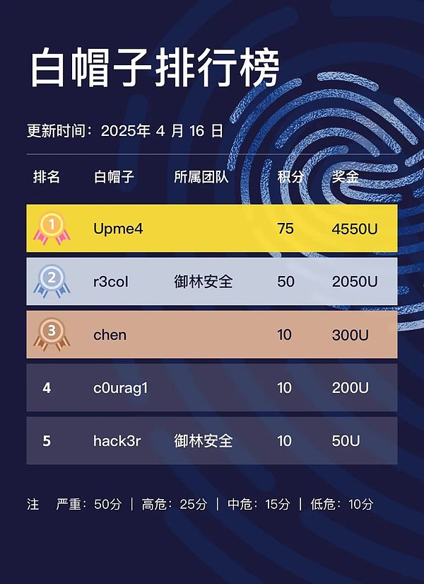 Upme4 以 75 分高居榜首,提交多个高危漏洞修复方案,三周累计奖金突破 4550U,展现顶尖技术实力。御林安全团队表现亮眼,成员 r3col、hack3r 协同作战,积分与奖金双丰收。同时恭喜 chen 获得 10 分的同时赢取 300 U 的奖金,荣获目前排行榜第三名,以及 c0urag1 获得 10 分以及 200U 奖金。同时也恭喜,鼓励其他获得积分以及奖金,以及正在发掘漏洞的白帽子。