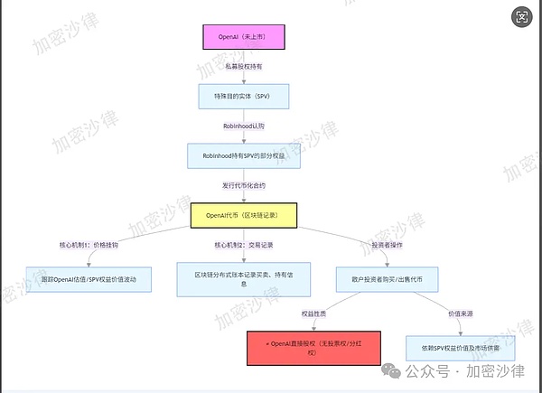 再回到OpenAI与Robinhood的说辞,OpenAI 否认的是 “代币 = 股权”,强调未授权任何股权关联产品,这与流程中 “代币≠直接股权” 一致;Robinhood 承认代币是“挂钩价格的合约”,与流程中 “通过 SPV 间接挂钩价值” 的设计一致。双方争议点在于 “这种间接挂钩是否合法合规”,而非流程本身的事实描述。