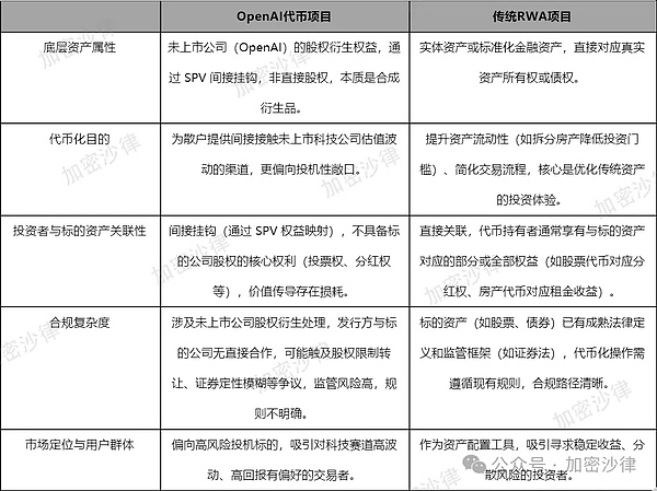显而易见,Robinhood 发布OpenAI 代币事件与传统RWA(现实世界资产)项目也存在多方面区别,具体如表1所示: