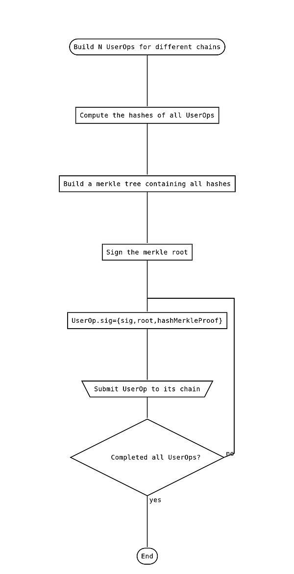 具体运行原理是:在 EIL 中,用户使用 ERC-4337 账户,其逻辑针对多链使用场景进行了优化。钱包会生成多个不同的 UserOps,然后对所有这些 UserOps 的 Merkle 根进行单次授权签名。每个链上账户的验证部分需要 (i) 一个 UserOp,(ii) 一个 Merkle 分支,证明其属于某个 Merkle 树,以及 (iii) 对该 Merkle 树根的签名。