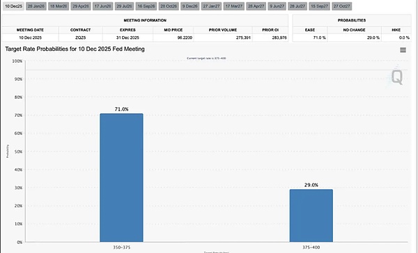 这种「信息真空」对风险资产是致命的。即使 CME FedWatch 显示 12 月降息概率回升至 71%(市场押注年内共降息 75bps),资产价格却并未跟随上涨。原因在于,市场担忧在缺乏数据支撑的情况下,美联储的降息可能被视为一种「恐慌性举措」而非「预防性举措」,或者美联储因缺乏数据而选择暂停降息,导致政策失误。市场厌恶的不是坏消息,而是不确定性。当前这种「因数据缺失导致的二阶不确定性」,使得资金更倾向于场外观望,而非入场博弈。
