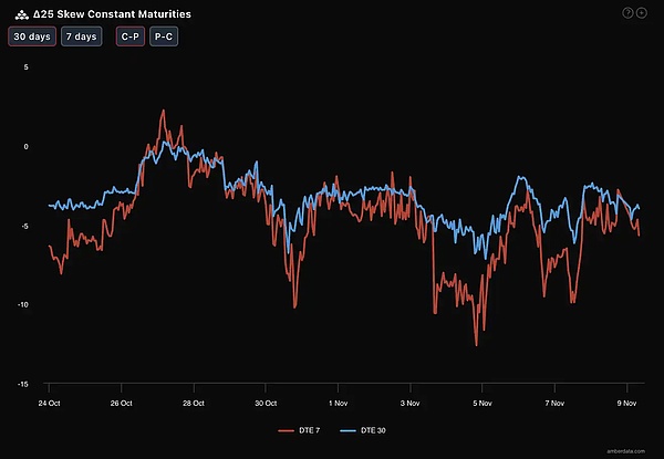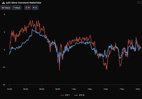 宏观层面,政府关门危机引发的数据发布停摆,正在给美联储的决策蒙上一层厚厚的「数据迷雾」。期权市场正在为这种「不可知」的不确定性重新定价:IV(隐含波动率)短端显著抬升,Skew(偏度)深度负值固化,市场正在从单纯的「交易降息」转向「交易衰退与政策失误风险」。