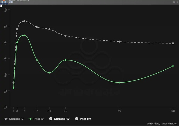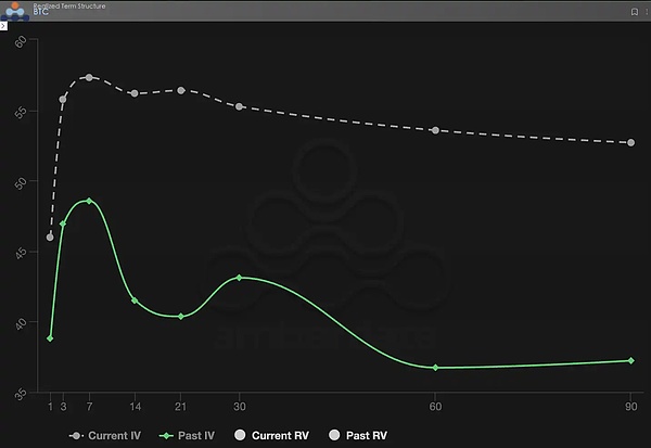 从期限结构来看,上周 BTC 与 ETH 的隐含波动率曲线并非典型的 Contango(近低远高)形态,而是出现了近端 IV 明显抬升、远端保持高位的「驼峰」式结构。