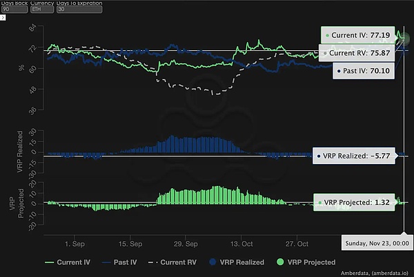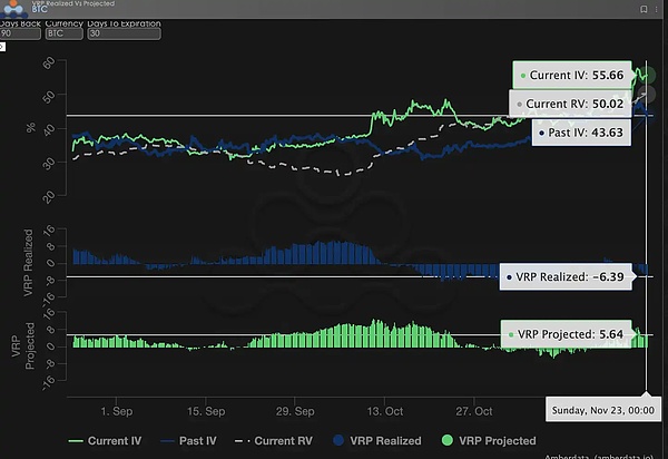 VRP(波动率风险溢价=隐含波动率 IV - 已实现波动率 RV)是衡量期权定价是否合理的重要指标。当前市场正处于「惊魂未定」的剧烈修正期。虽然 IV 已大幅抬升以修复定价偏差,但 VRP 数据的结构性背离揭示了潜在风险:历史实际波动远超预期,当前的高溢价看似诱人,实则可能仍不足以覆盖未来的尾部风险。