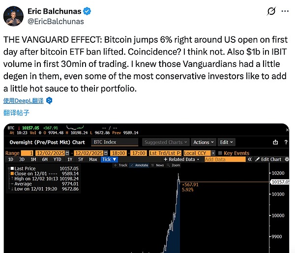 12 月 2 日,先锋集团在其官网发布了一篇题为《加密货币与先锋集团:投资者需要了解什么》的公告,正式宣布将允许客户通过其经纪账户交易部分第三方加密货币 ETF 及共同基金。彭博社 ETF 分析师 Eric Balchunas 更是将随后市场出现的显著反弹现象,称为「先锋效应」。
