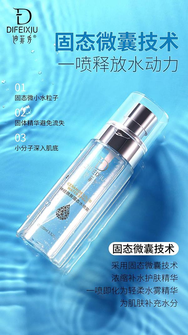 高科技固态微囊技术,浓缩补水护肤精华,一喷即化为轻柔水雾精华,深入肌肤底层。 神经酰胺成分可以多重水润呵护肌肤,保持莹润通透的肌肤状态,舒缓晒后肌肤,妆前适当使用,可以让妆容更服帖,随身携带,随时补充水分。