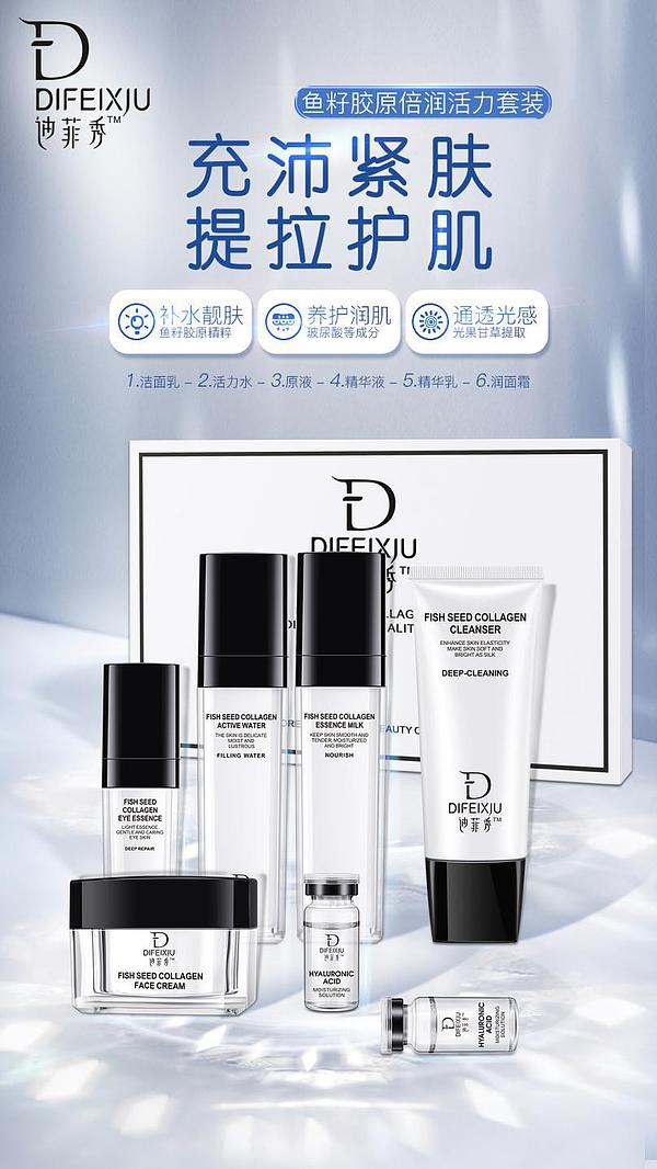 迪菲秀鱼籽胶原倍润活力套装 一盒全面解决肌肤问题。 蕴含鱼籽胶原精华,补水靓肤。 明星玻尿酸成分,养护润肌。 光果甘草提取,通透光感。 紧肤靓颜,平滑弹嫩,一盒搞定。